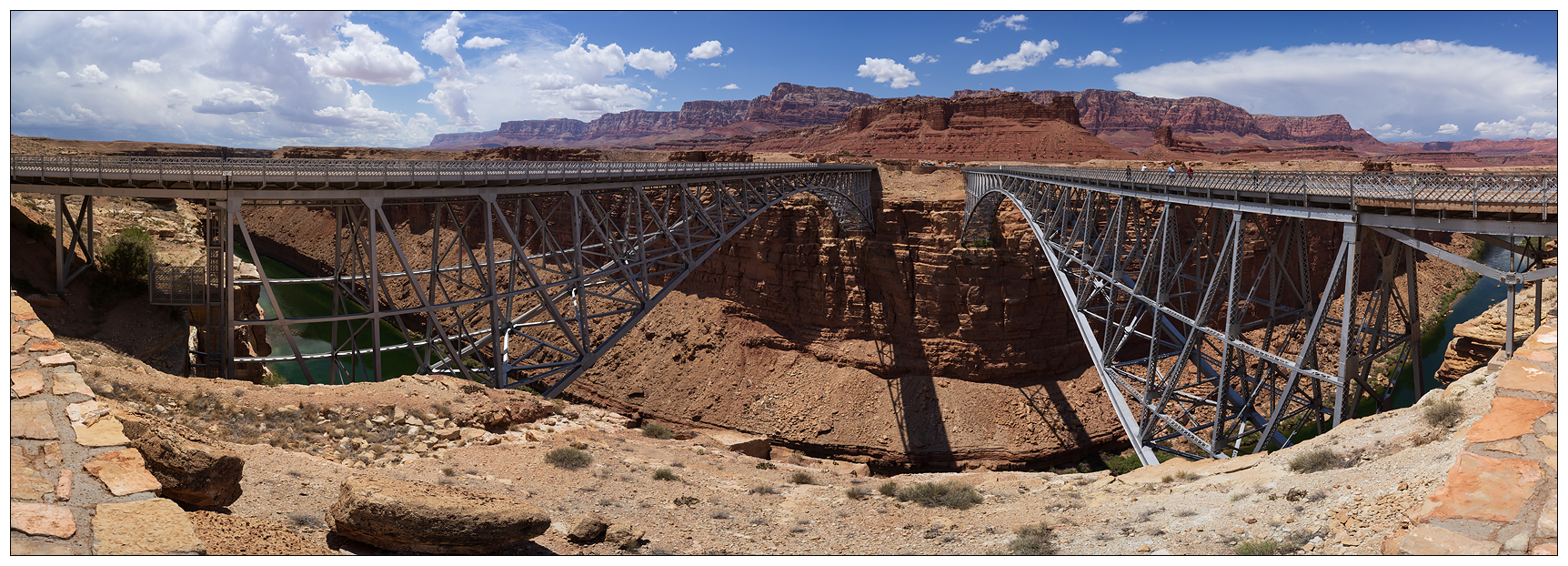 Navajo Bridge, Marble Canyon, Arizona. Rechts die erste Brücke Baujahr 1929, die linke Brücke kam 1995 dazu, weil es zu viele Unfälle mit Fußgängern gab.