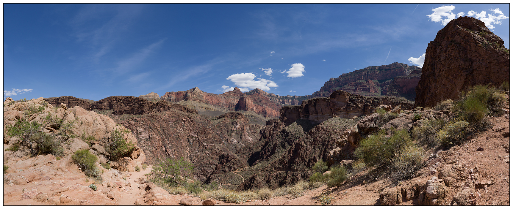 Auf den Bright Angels Trail,, etwa 1.100 m tief im Gand Canyon. Man kann noch weiter runter bis zum Colorado River, aber besser nicht an einem Tag wieder zurück. 1.500 Höhenunterschied sind das dann und es gibt extra Schilder, die davon abraten.